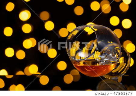 Glass of brandy on a black reflective background.