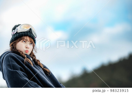 スノボを持ってゲレンデに立つ若い女性 スノーボードイメージ