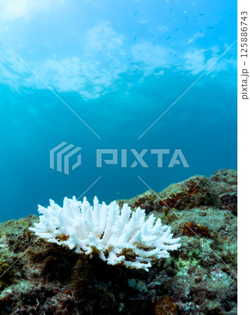 エンタクミドリイシ、フタマタハマサンゴ等。高水温で白化してしまったサンゴ。ヒリゾ浜中木南伊豆町伊豆