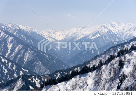 立山ロープウェイの黒部平駅付近から見下ろす黒部ダムと雪に覆われた雄大な山々の美しい冬景色