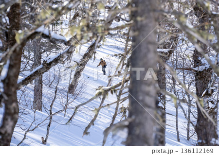 雪深い道東の森を滑走するバックカントリースノーボード冬山アクティビティの躍動感
