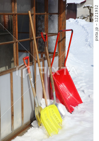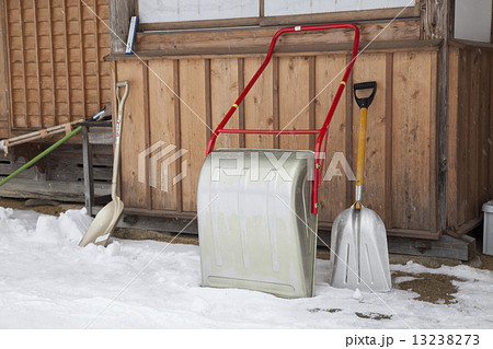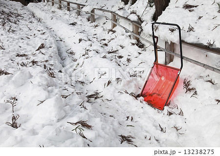 雪が積もった塀に立てかけたママさんダンプと除雪スコップ