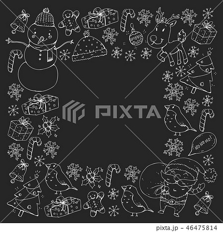 Winter Christmas vector pattern. Icons of Santa, snowman, deer, bell, Christmas tree. Merry