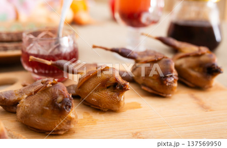Smoked grilled quail meat with thyme on a wooden board