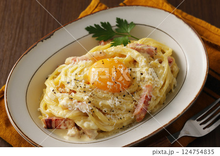 卵黄やカリカリに焼いたベーコンが入っているフェットチーネのカルボナーラを俯瞰で撮影