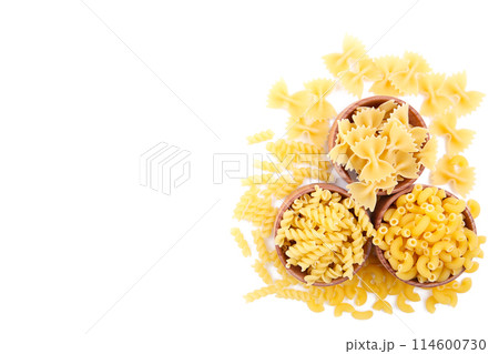 Pasta, many different varieties, overhead flat lay shot. Italian food and drinks