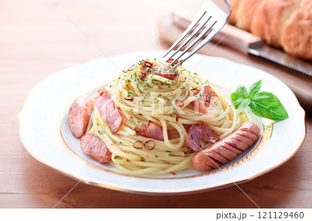 ベーコンとウインナーのペペロンチーノ スパゲティ