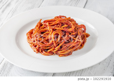Plate of spaghetti with tomato sauce on a white background