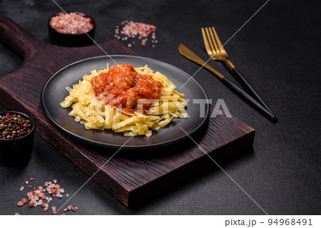 Pasta with beef meatballs in tomato sauce with spices and herbs on a dark background