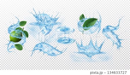 Splash of water. 3D wave. Ice in liquid. Drop lemon in whirlpool, drink aqua. Fluid flow, mint leaves and lime. Realistic spatters. Plop in ripple. Vector exact illustration on transparent background