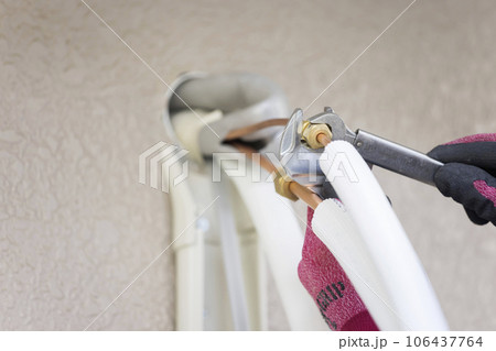冷媒管を工具で連結する作業員男性手元 エアコン取り付け工事