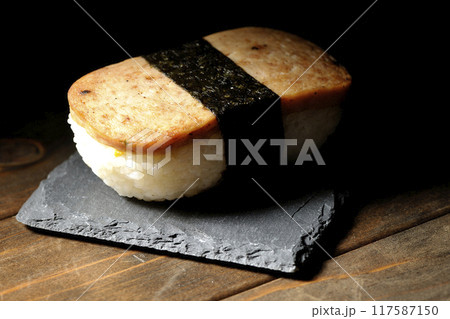スレートプレートに乗ったスパムむすびを黒背景で撮影