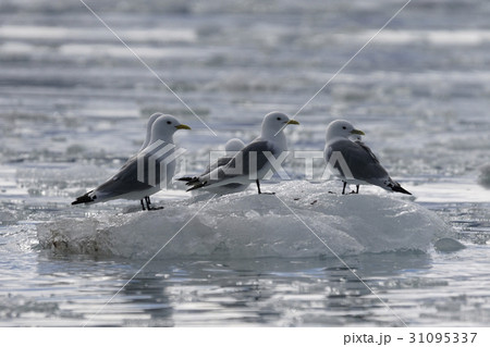Three cute fluffy white polar bears watching the sunset in natural habitat