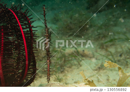A Ghost Pipefish, Solenostomus Paradoxus, hiding close to a Crinoid, soft coral in Philippines