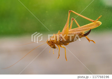 A large yellow female grasshopper with a black, long, curved ovipositor located below the long wings at the end of the abdomen in close-up. Characteristic long antennae are distinguished from locusts