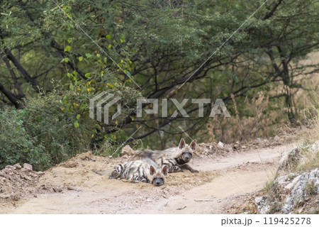 Wild Striped hyena or hyaena hyaena family or pair calm with face and alert with ears in action blocking road or forest track during outdoor jungle safari in ranthambore national park rajasthan india