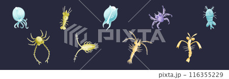 Plankton Diverse Water Organism Free Floating on Dark Background Vector Set