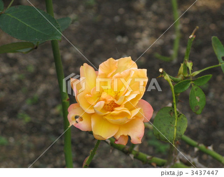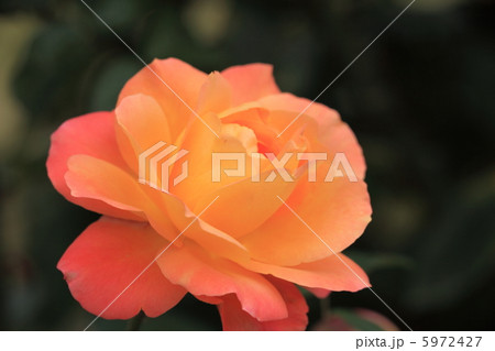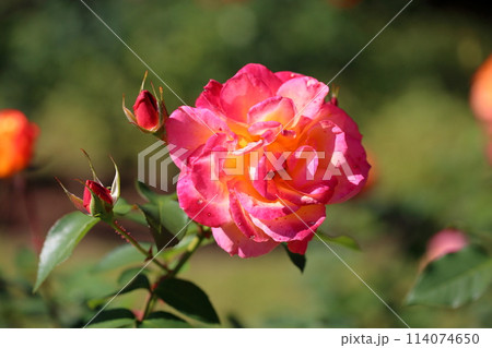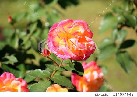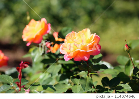 ピンクとオレンジと黄色の混ざった花びらのスブニールドゥアンネフランクという薔薇の花のアップの風景