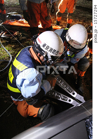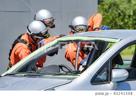 出初式の消防訓練で交通事故の自動車から搭乗者を救出する救助訓練を行うレスキュー隊員