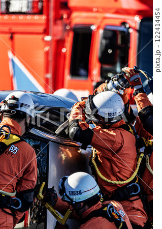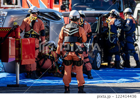 出初式の消防訓練で事故で横転した自動車のルーフを油圧カッターで切断する救助訓練を行うレスキュー隊員