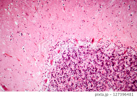 Human motor cortex, photomicrograph showing pyramidal neurons in cortical layers responsible for voluntary movement control and motor coordination.