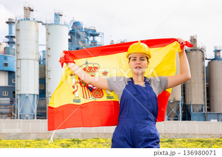 Sad woman in overalls with Spain flag in her hands against the background of chimneys of modern factory