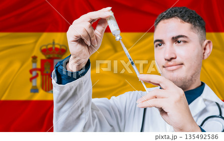 Doctor holding syringe on Spain flag background. Medical professional holding syringe with Spanish flag in the background
