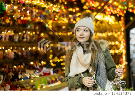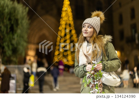 Young woman standing t on the background of lights and garlands