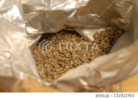 開封したアルミパッケージに詰まったコーヒー生豆のディテール