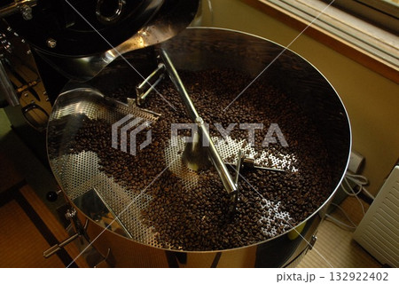 大型ロースターで回転するコーヒー豆の香ばしい焙煎シーン