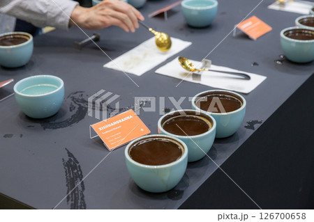 【日本】東京都江東区の東京国際展示場で開催されたコーヒーイベントでカッピング用に並べたカップ