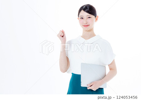 パソコンを持つ笑顔の女性