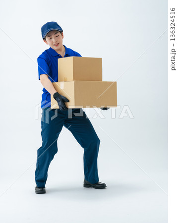 荷物を運ぶ作業服の女性の全身写真