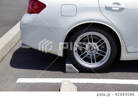 バック駐車した乗用車の後輪が駐車場の車止めに当たった状態