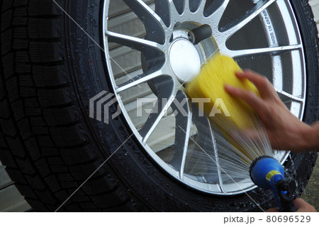 冬タイヤのホイールの表側を手作業で丁寧にシャワーとスポンジで水洗いしている光景