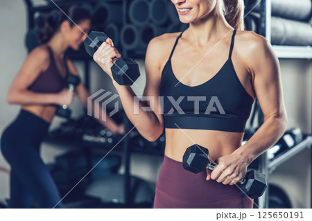 Fit and sporty young caucasian women with dumbbells in the gym