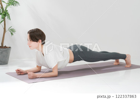 A young woman practices yoga and stretching with a mat and gym props, showcasing wellness, motivation,