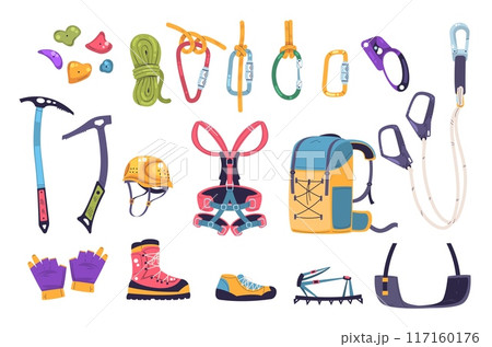 Alpinist gear equipment cartoon vector set. Backpacks ropes ice axes helmet knives bootstraps cords carabiners crampons wires, extreme sharp mountains climbing inventory sport, isolated artworks