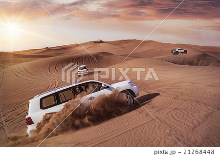 White car driving in Rub al Khali Desert at the Empty Quarter, in Abu Dhabi, United Arab Emirates at sunset