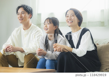 ソファーに座りテレビ観戦する3世代ファミリー リビングダイニング