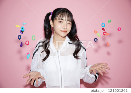 ピンク背景で撮影をしたスポーティな服装をした若い女性のキュートなポートレート