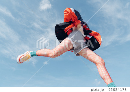 おしゃれなスポーツファッションでジャンプする女性
