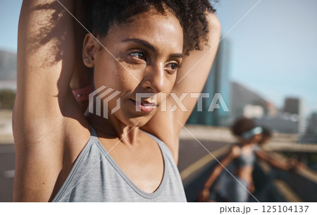 Fitness, woman and stretching arms for sports exercise, workout and training in the city outdoors. Active female in sport stretch for health, wellness and motivation for physical activity outside