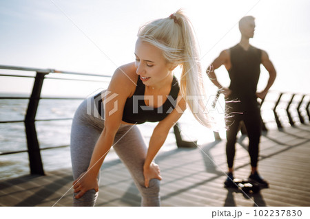 Romantic couple doing sport together at the beach pier. Two sporty athletes doing warming-up excersises.