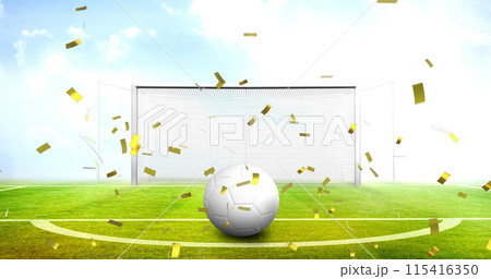 Image of confetti and football over stadium