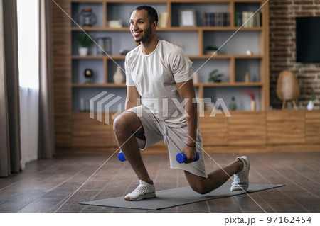 Athletic Black Man Doing Lunges Exercise With Dumbbells While Training At Home