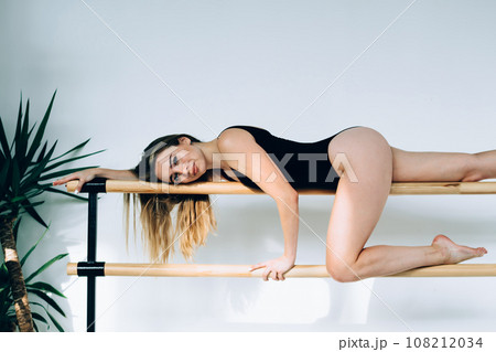 Slim female lying on gymnastic apparatus