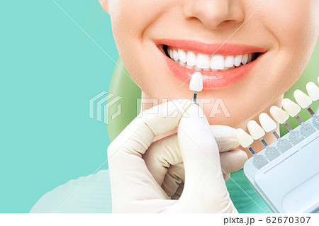 Close up portrait of Young women in dentist chair, Check and select the color of the teeth. Dentist makes the process of treatment in dental clinic office. Teeth whitenning