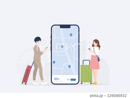 地図を見たりスマホで検索をする人々のフラットでシンプルなイラスト