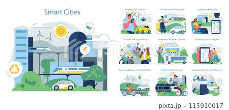 Urban Transportation Methods set. Diverse mobility options in city life. Integration of eco-friendly vehicles and public transport. Navigation through tech advancements.